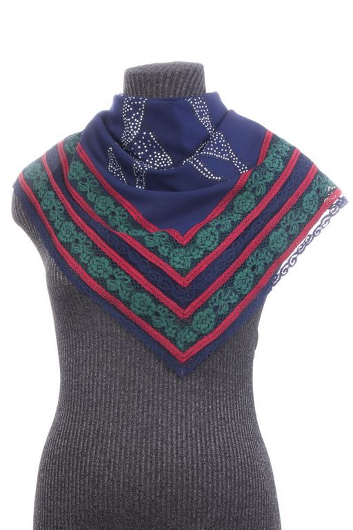 Платок из мягкого и плотного трикотажного полотна темного синего цвета в сочетании с широким фактурным кружевом. Отделка - рисунок из страз.