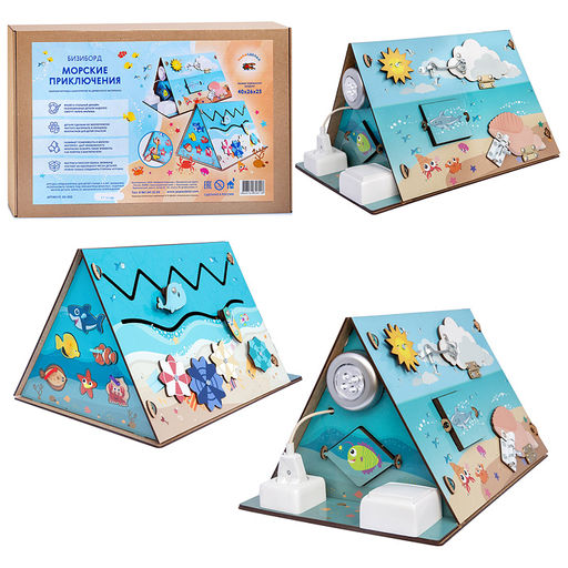 С нашим бизибордом ребенок погружается в удивительный мир морских приключений. Играя, ребенок развивает мелкую моторику, усидчивость, память и обучается различным навыкам, таким как включение выключение света, открытие закрытие крючков и щеколд. А также, малыши полностью удовлетворяют свой интерес к розеткам, безопасно осваивая столь интересующий их предмет. В процессе игры ребенок изучает морских обитателей, на бизиборде можно поиграть с рыбками и черепашками, найти крабика который прячется за ракушкой и покататься с китом. А еще можно покатать пупса на серфе и посмотреть кто прячется за облаками.