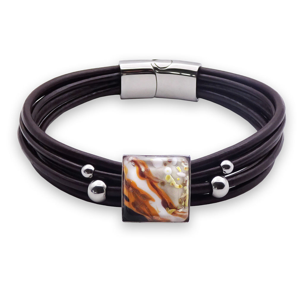 Браслет изготовлен из муранского стекла, натуральной кожи и гипоаллергенной ювелирной стали, что очень важно для людей с чувствительной кожей. Металл не темнеет и не подвергается воздействиям окружающей среды, надолго обеспечивая красивый внешний вид изделия. Крепкий магнитный замок с двойной защитой надежно фиксируется на запястье. Ширина браслета - 1,5 см. Размер стеклянного элемента - 1,6x1,6 см. Вес - 19 гр.