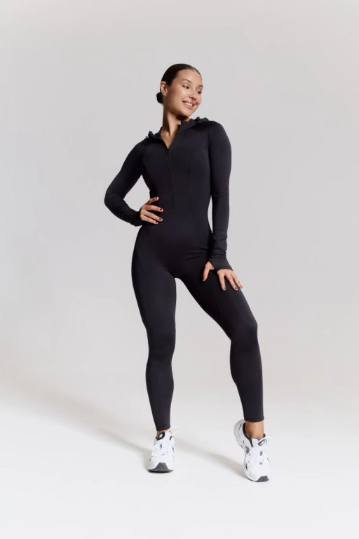 – Комбинезон с длинными рукавами и капюшоном, универсальная модель для тренировок, активного отдыха и городского athleisure.