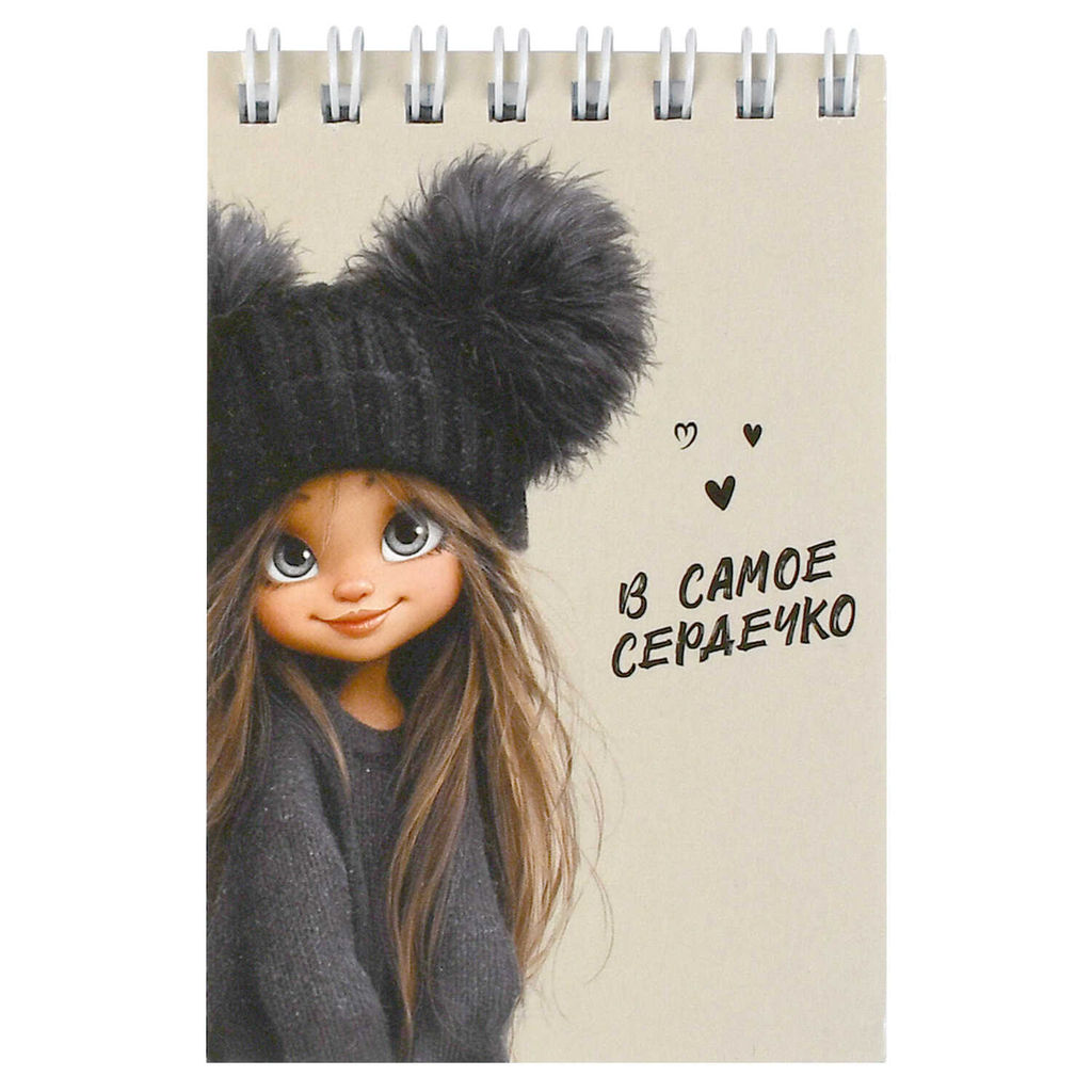 Блокнот, А7, 40 л, арт. 73419 ДЕВЧОНКА В ШАПКЕ / Блок - белый офсет 65 г/м?, клетка, гребень по короткой стороне, УФ-лак сплошной,