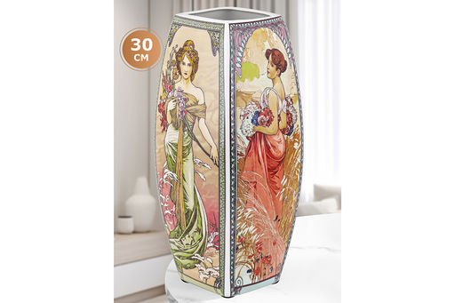 Настольная ваза Elan Gallery "Времена года" размером 12,5х12,5х30 см и объёмом 3 литра прямоугольной формы выполнена из фарфора нового поколения new bone china. Благодаря современным технологиям этот вид не уступает традиционному костяному фарфору в прочности, но гораздо экологичнее в производстве. В коллекции бренда Elan Gallery можно найти много красивой посуды и предметов декора с изображениями по мотивам шедевров мировой живописи! Высокая вазочка украшена репродукциями картин и панно чешского художника Альфонса Мухи. На каждой стороне фарфорового изделия изображены девушки, символизирующие лето, весну, зиму и осень. Яркий и узнаваемый сюжет удачно впишется в любой стиль интерьера, добавляя красоты и романтики. Интерьерная ваза подойдёт для размещения букетов, искусственных цветов или сухоцветов. Она послужит элементом декора вашего дома и поможет украсить его любыми растениями. Как красиво будут смотреться букеты из живых цветов и веточек на кухне и в любой комнате! Поставьте на видное место розы, тюльпаны или вербу для оформления интерьера в квартире. Интерьерная ваза украсит комнату даже без наполнения и подойдёт для создания декоративных композиций на журнальном столике или полке. Эргономичная форма позволит поставить в неё цветы с длинными стеблями. Не рекомендуется применять абразивные моющие средства. Поставляется в прочной красочной коробке. Благодаря стильной коробочке вам не понадобится дополнительная подарочная упаковка. Станет шикарным подарком вашим близким на любой праздник. Сделайте сюрприз ценителям искусства! Красивая фарфоровая ваза с рисунком станет украшением вашего дома и подчеркнёт красоту любого цветка. Ознакомьтесь с другими товарами для дома от Elan Gallery, здесь вы найдёте всё для создания домашнего уюта!
