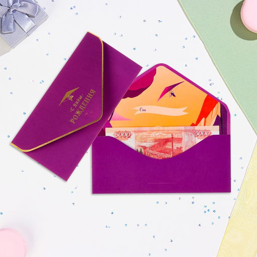• Конверт "С Днём Рождения!" вырубка, тиснение, софт тач, фиолетовый фон