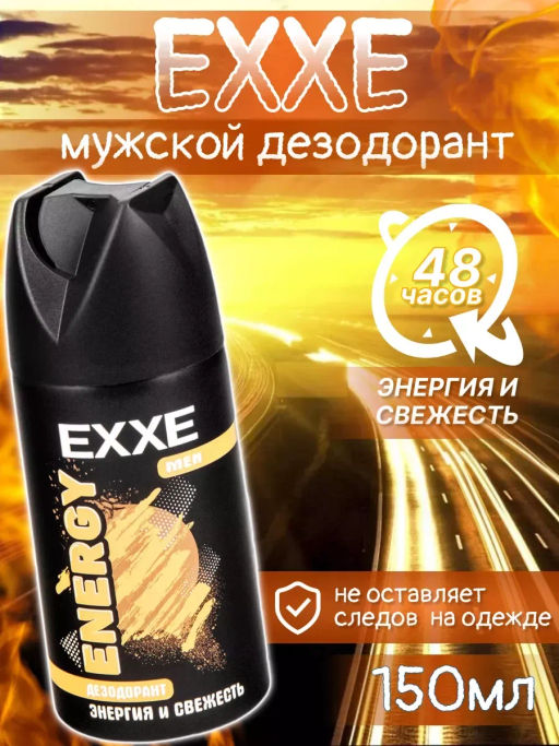 EXXE MAN мужской дезодорант-аэрозоль ENERGY это незаменимый помощник в борьбе с неприятным запахом пота. Он обладает терпким ароматом, который держится до двух дней, оставляя кожу свежей и чистой.