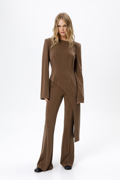 Трикотажный костюм-двойка из асимметричной туники и облегающих брюк-клеш.­