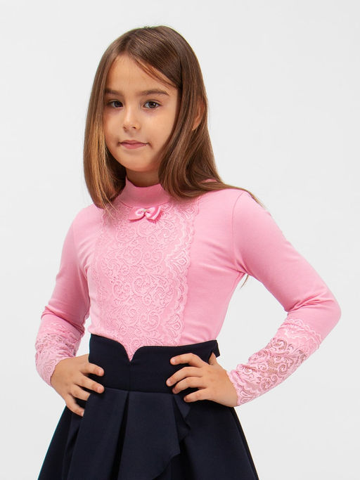 Изысканный гипюр на рукавах и передней части блузки образует цветочный узор. Воротник - стойка. Мягкий, приятный к телу трикотаж обеспечит идеальную посадку изделия по фигуре. Гармонично вольется как в школьный, так и в праздничный гардероб.