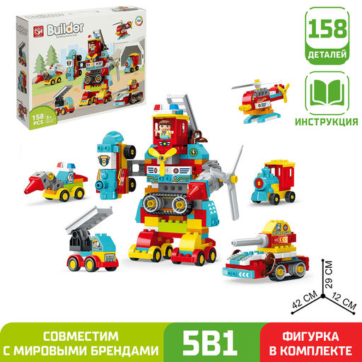 Из деталей конструктора малыш сможет собрать машинки, а из них большого робота трансформера! Игра с роботом даст ребёнку возможность пофантазировать и разыграть целую историю о приключении киборга в большом городе.ХарактеристикиВ наборе 158 деталей и подробная инструкция.Набор 5 в 1 совместим с игрушками мировых брендов.В комплект входит фигурка человечка.Размеры готового робота: 42 12 29 см.У игрушек есть подвижные элементы.Детали изготовлены из качественного и нетоксичного пластика, безопасного для здоровья детей.Этот набор идеальный подарок на день рождения, Новый год, 23 Февраля или без повода, чтобы просто порадовать непоседу. Возраст: От 3 лет. Среднее время сборки, мин: 80. Количество элементов: 158. Вид: Для малышей. Тематика конструктора: Роботы. Уровень сложности: Начальный. Бесплатная доставка: Да. Размеры товара: 10/33/45.