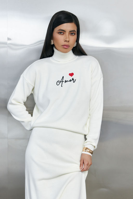 Джемпер свободного силуэта с вышивкой в области груди. Рукав втачной в спущенную пройму. Низ изделия и низ рукава оформлены резинкой, воротник-стойка с отворотом. Изделие выполнено из мягкой структурированной пряжи.