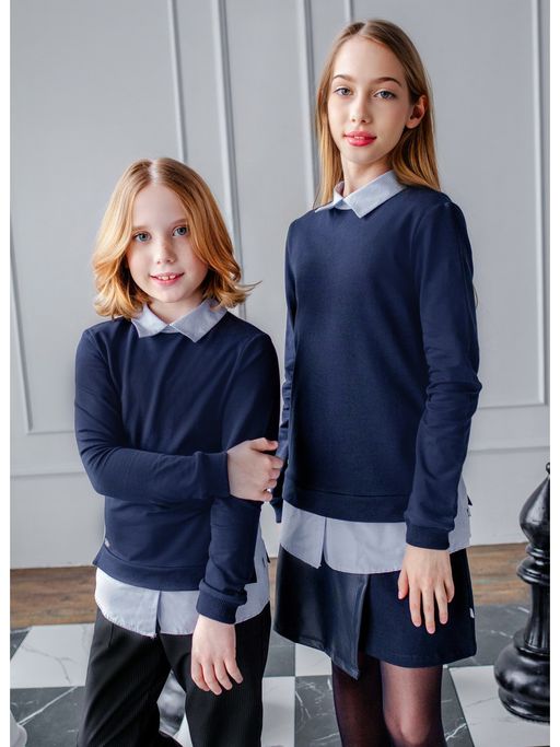 Джемпер -обманка для девочки из футера 2-х нитки и сорочечного полотна. Рукав втачной длинный , оформлен притачным манжетам, горловина воротником со сойкой и застежкой по планке на петли-пуговицы. Состав:92% хлопок, 8% лайкра