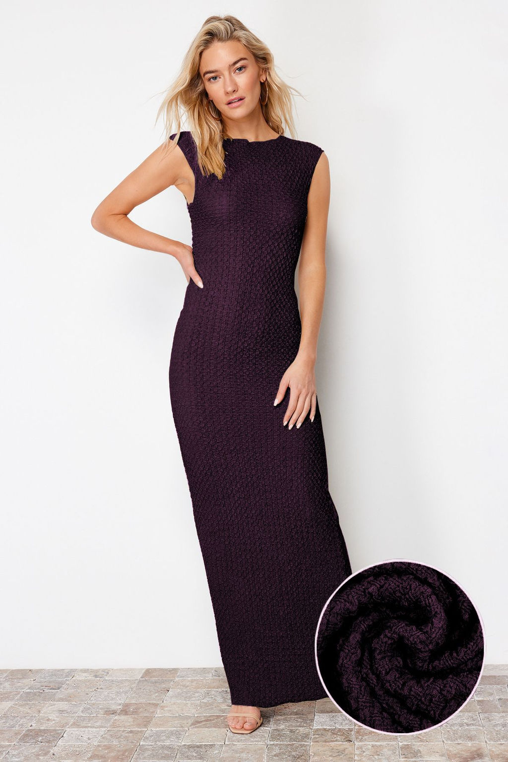 Murdum Dokulu Kumas Fitted/Vucuda Oturan Ay Kol Esnek Orme Midi Kalem Elbise TWOSS24EL00103