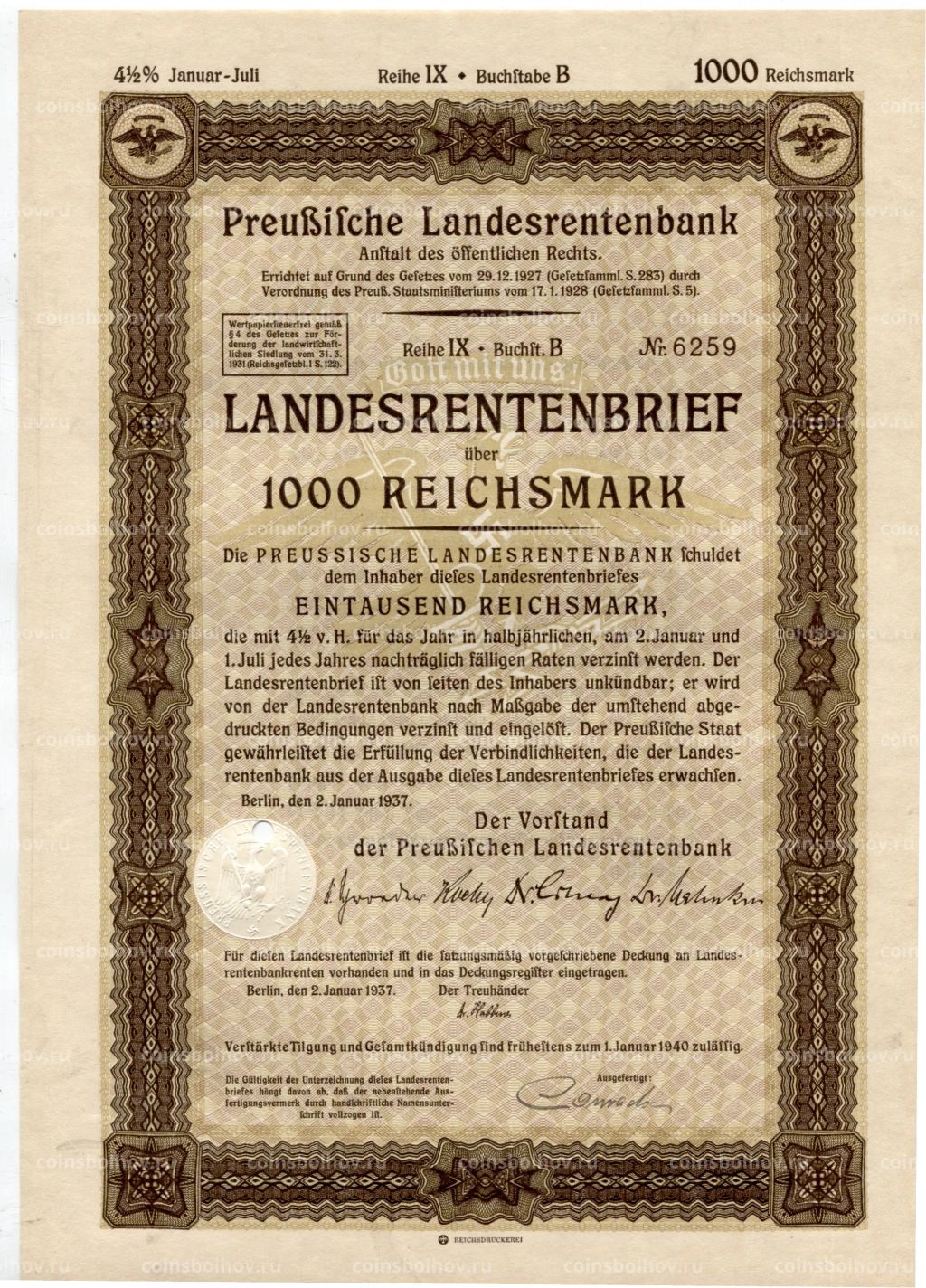 • Облигация 4,5% 1000 рейхсмарок 1937 года Германия