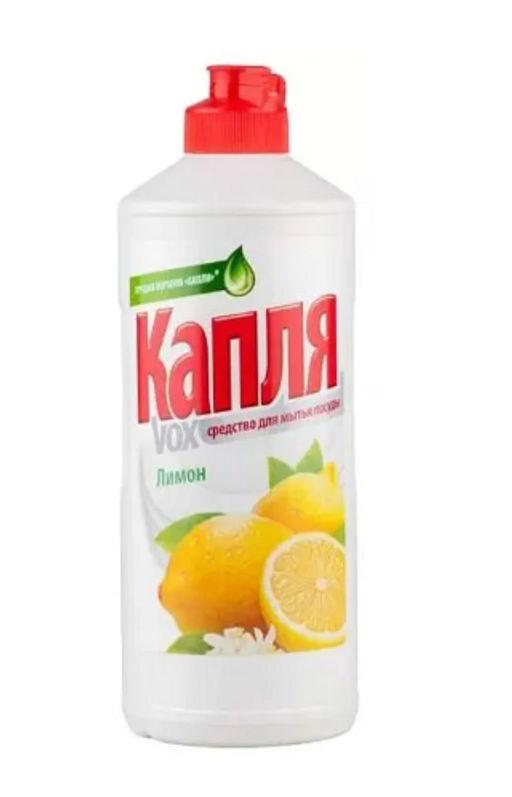 Средство для мытья посуды жидкое Капля VOX Лимон, объём 500 мл. бесследно уничтожает загрязнения любой сложности