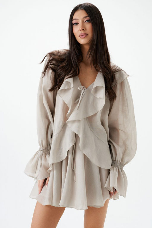 Блузка прямого свободного кроя, выполнена из лёгкого натурального полотна - рами. Горловина V-образная, с притачной рюшей по всей длине горловины и борта. Застежка на два ряда шнура- завязки. Рукав вточной-длинный заканчивающийся цельнокраеной манжетой, выделяемой на рукаве отделочными строчками с использованием нити-резинки. Длина по спинке 67см, длина рукава 71см.