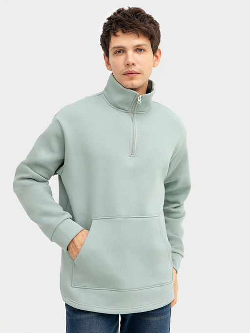 Новинка зимней коллекции свитшот мужской из трикотажного полотна футер с подчесом. Имеет свободный, прямой крой. Горловина округлой формы с воротником-стойкой. Рукава втачные, длинные. Линия плача слегка спущена. По низу рукавов отрезные манжеты. По переду отрезная кокетка. Центральная застежка на тесьму-молнию. Спереди есть накладной карман-кенгуру. Стильная и невероятно удобная модель для создания комфортных и уютных образов. Подойдет в качестве базовой одежды и тем, кто любит проводить много времени на прогулках с друзьями в зимний период времени. Теплый мужской джемпер согреет вас и не даст замерзнуть. Дополнить можно низом в тон из линейки мужской одежды. Рекомендуем!­