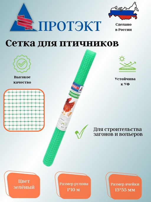 етка для птичников 13х15мм 1х10м зелёная - это высококачественный материал, который предназначен для ограждения загонов и вольеров. Благодаря мелкой ячейке размером 13х15 мм, птенцы не смогут покинуть огражденную территорию, что обеспечивает безопасность и комфорт для птиц. Сетка изготовлена из полиэтилена, что делает ее прочной и устойчивой к различным погодным условиям. Полимерное покрытие обеспечивает дополнительную защиту от ультрафиолетового излучения, что позволяет использовать сетку в течение всего года. Ширина сетки составляет 10 метров,а высота - 1 метр,что позволяет покрыть большую площадь и создать надежное ограждение. Вес сетки составляет всего 0,44 кг,что делает ее легкой и удобной для транспортировки и установки. В упаковке поставляется одна сетка для птичников, что позволяет сэкономить на приобретении дополнительных материалов. Выбирая сетку для птичников, вы обеспечиваете безопасность и комфорт для ваших птиц, а также получаете долговечный и надежный материал для ограждения загонов и вольеров. -- Характеристики -- Артикул: Ф-13/1/10 Материал: Пластмасса Страна Производитель: Россия