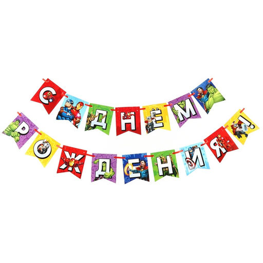 • Гирлянда на ленте «С Днем Рождения», Мстители, 176 см