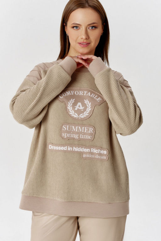 Свитшот с эффектной комбинацией двух видов трикотажа: вязка и гладкий, свободного силуэта, с круглой горловиной. Рукав длинный, с притачной манжетой. По линии плеча отрезные кокетки с защипами. На переде изделия аппликация с необработанными срезами с авторским шрифтовым принтом.
