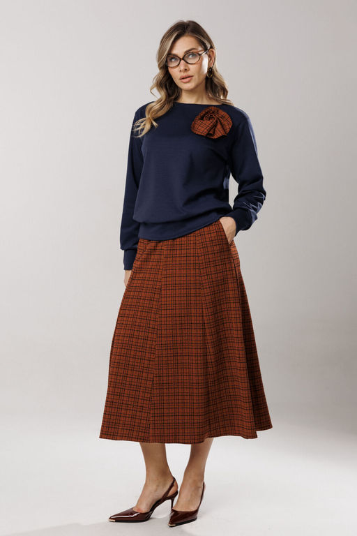Состав: Джемпер: Вискоза-20%; ПЭ-75%; Спандекс-5%; Юбка: Вискоза-45%; ПА-21%; ПЭ-34%; Элегантный комплект, состоящий из блузона и удлиненной юбки из клиньев. Блузон из уютного трикотажного полотна, свободного прямого силуэта. Линия плеча чуть спущена, рукав прямой, на зауженной манжете. Длина рукава, вместе с плечевой линией 78 см. Из них 13 см: длина плеча и 65 см: длина рукава с напуском. Высота манжета 8 см. Горловина создана в стиле лодочка. Низ блузона оканчивается притачной манжетой: поясом, высотой 7,5 см. Длина блузона по спинке изделия 61 см. Юбка состоит из 8-ми клиньев, с умеренным расширением по низу изделия. В боковых швах расположены наклонные функциональные карманы. В центральном шве переднего полотнища расположена застежка на молнию. Линия талии обработана притачным поясом со шлевочными держателями. В боковых сегментах пояса вставлена эластичная тесьма для дополнительного регулирования объема талии. Высота пояса 4,5 см. Застежка в поясе на две функциональные петли/пуговицы. Длина изделия 84 см. Декоративным дополнением к комплекту выступает съемная текстильная брошь в виде цветка (фурнитура может отличаться от представленной на рекламном фотоматериале) Особые рекомендации: рекомендуется холодная деликатная ручная стирка, без использования отбеливающих СМС, без интенсивного трения. Сушка в вертикальном положении. ВТО с минимальным паром. -- Характеристики -- Состав: Джемпер- Вискоза-20%; ПЭ-75%; Спандекс-5%; Юбка- Вискоза-45%; ПА-21%; ПЭ-34%; Сезон: Весна Рост: 164 Страна бренда: Беларусь