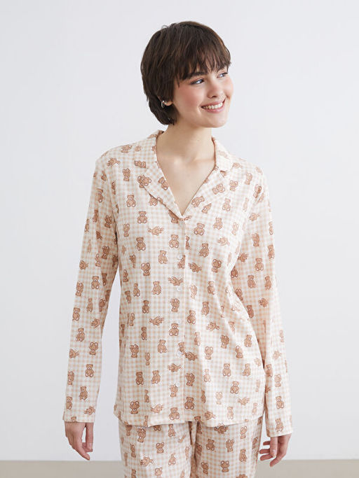 G?mlek Yaka Ay? Bask?l? Kad?n Pijama ?st?