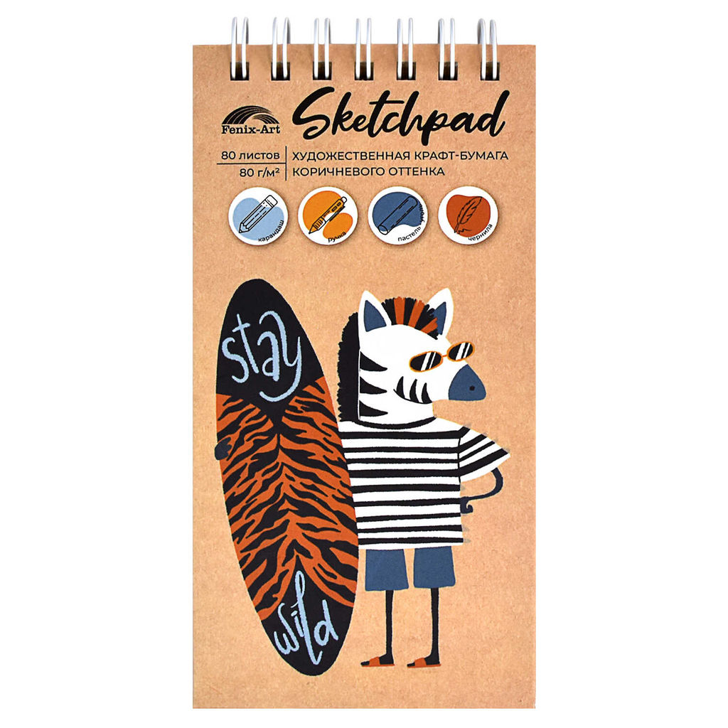 Скетчпад 105х210 мм, 80 л, блок - крафт-бумага 80 г/м?, арт. 60584 ЗЕБРА-СЁРФЕР /обложка полноцветная печать, твёрдый переплёт на гребне, матовая ламинация,