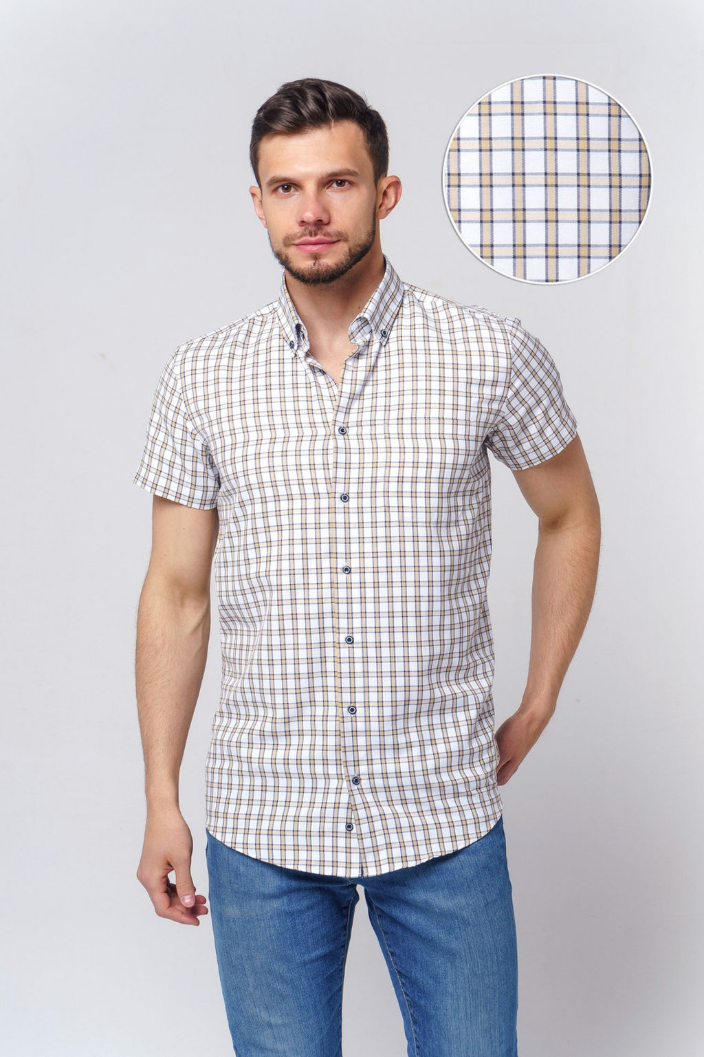 Рубашка прямого кроя с современныи дизайном в клетку песочного цвета с коротким рукавом. Воротник button-down. Котрастный кант по краю правой полочки, контрастные пуговицы. 1 карман