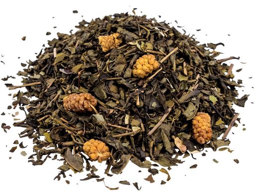 Бленд среднелистового китайского зеленого чая, ягод шелковицы и листа земляники. С ежевичным ароматом.