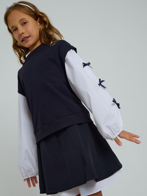 Джемпер-обманка для девочки из кулирной глади с лайкрой, прямого силуэта, спущенное плечо, круглая горловина. Рукав длинный из сорочечной ткани, внизу на резинке. Рукава декорированы бантиками.