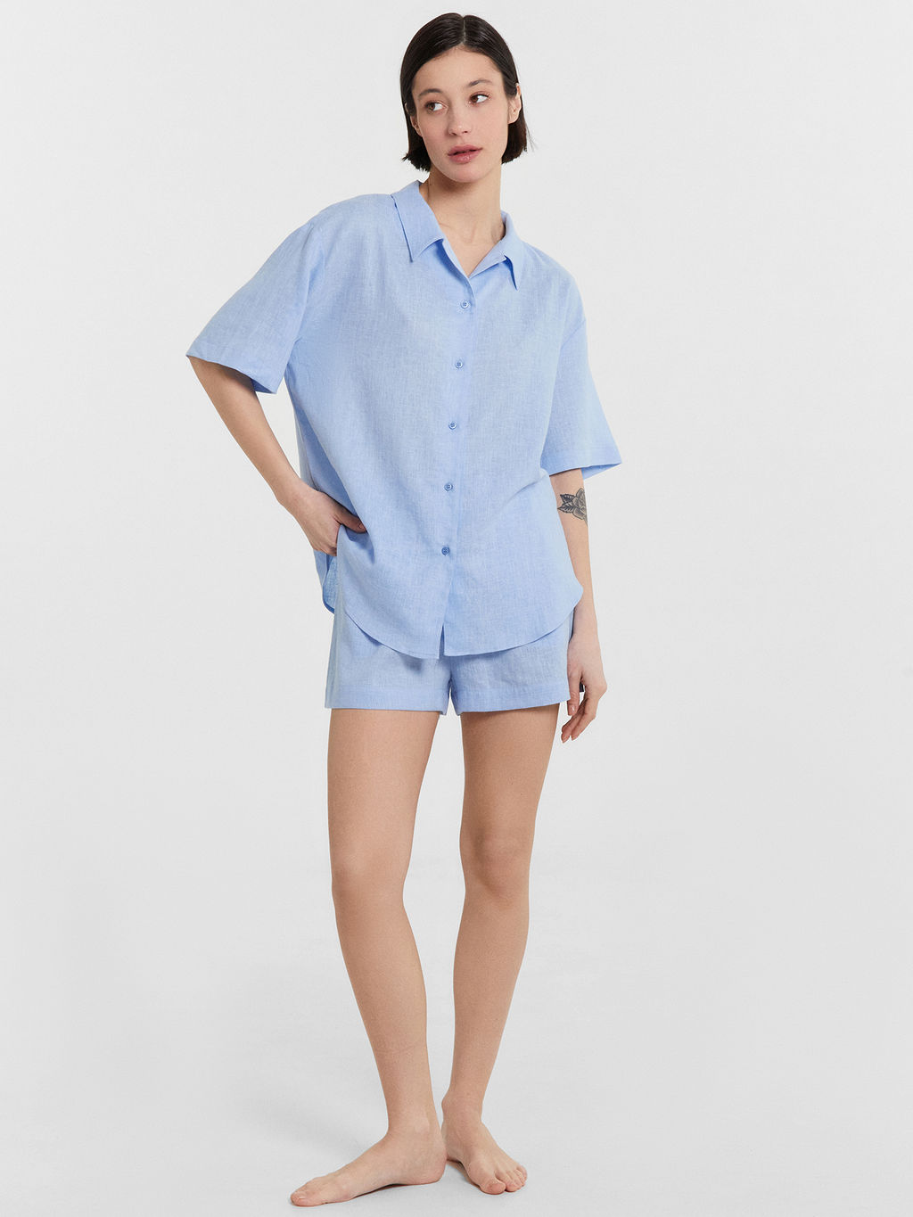 Женская пижама, выполненная из сочетания льна и вискозы. Она сочетает в себе стиль и комфорт, идеально подходя для повседневного ношения дома. Рубашка свободного силуэта с отложным воротником и короткими рукавами имеет центральную застежку на пуговицах, что обеспечивает удобство и легкость в носке. Шорты свободного кроя с высокой посадкой и карманами в боковых швах добавляют практичности и комфорта. Модель выполнена из натурального льна и вискозы. Такое сочетание материалов обеспечивает оптимальный комфорт и долговечность. Лён - это натуральный материал, который обладает отличными дышащими свойствами и дарит прохладу в жаркие дни. Вискоза, в свою очередь, добавляет мягкости и шелковистости, делая изделие особенно приятным к телу. Эта пижама станет вашим любимым выбором для уютных вечеров и расслабленного отдыха дома.­