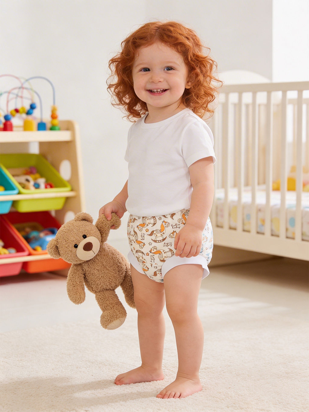 Детские трусики из однотонного хлопкового трикотажа с детским рисунком. Подходят под подгузник. Пояс подогнут и прошит двойной строчкой, вставлена эластичная резиночка. Резинка регулируется через отверстие сбоку. На ножках мягкие эластичные манжеты. Можно носить дома и на улице в теплые летние дни. Можно создать комплект с ясельными футболочками.