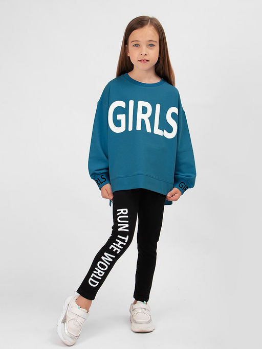 Костюм для девочек (толстовка, лосины) из футера. Толстовка силуэта-оверсайз, с рукавом 1/4, украшена принтом, на манжете рукава принт. Лосины с принтом, по талии на широкой резинке.