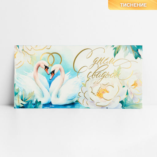 • Цена за 10 шт. Конверт для денег «С днём свадьбы», лебеди, тиснение, 16.5 х 8 см