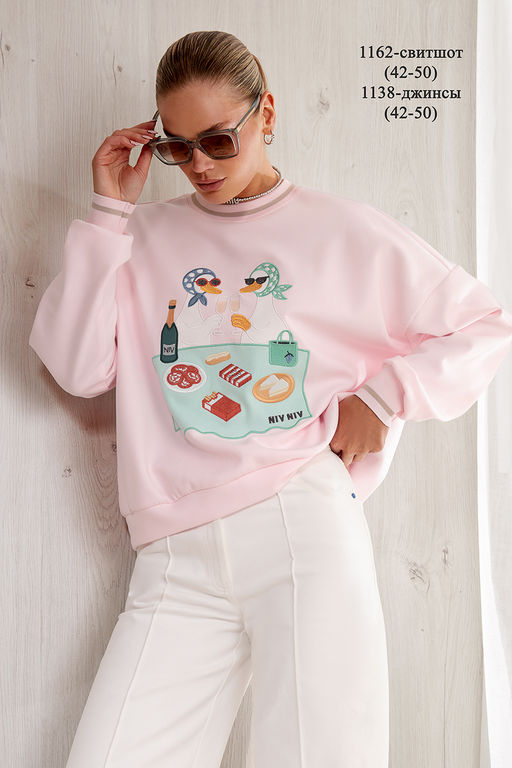 Объемный свитшот из плотного премиального трикотажного полотна(интерлок). Изделие прямое. Горловина круглая с притачной планкой из отделочной ткани. Рукав спущенный, длинный, объемный. Низ рукава на манжете из отделочной ткани. Низ изделия на планке из отделочной ткани. Перед и спинка изделия прямые. На передней половинке свитшота авторская вышивка.