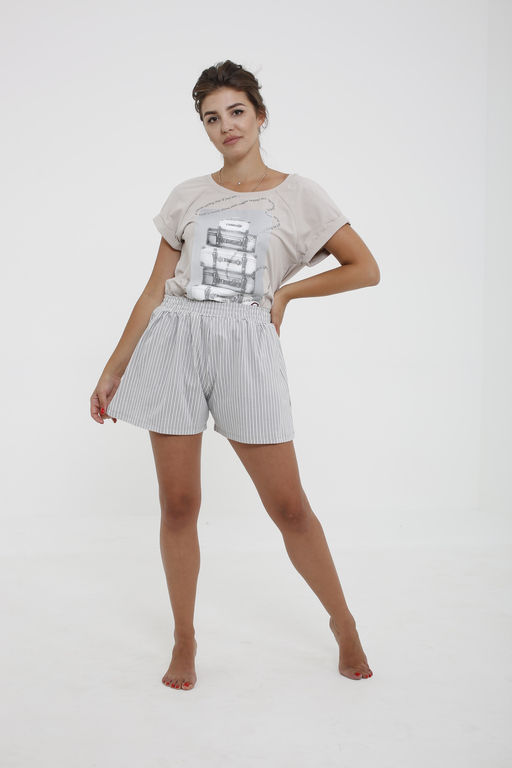 Комплект с шортами и футболкой. Футболка не приталенного силуэта, рукав реглан с манжетом, на полочке декоративная печать в стиле шелкографии с добавлением глитерра. Шорты на резинке без карманов.