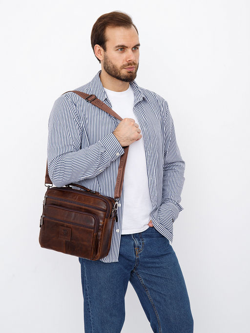 Удобная мужская сумка, выполнена из натуральной кожи.  Дополнена темной фурнитурой. Данная модель закрывается на молнии, носится на плече или через плечо с помощью съемного ремня. Каркас полужесткий.