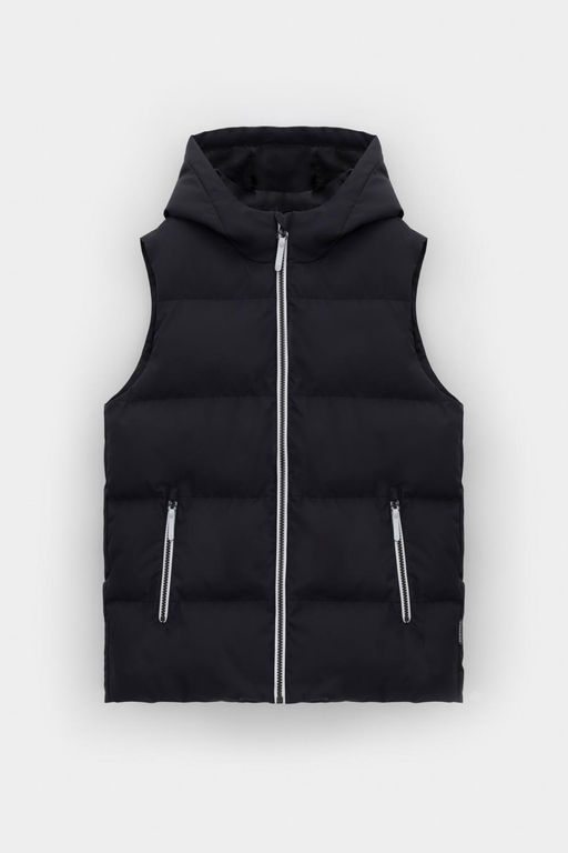 Стеганый жилет с капюшоном для мальчика с утеплителем Fellex®: 120 г/м2. Выполнен из мембранной ткани с дополнительной тефлоновой обработкой. Данный вид обработки предохраняет изделие от загрязнения и лучше отводит влагу. Подклад из 100% полиэстра. Капюшон не снимается. Изделие застёгивается на молнию, предусмотрена защита подбородка. Два кармана по бокам застёгиваются на молнии. Во всех изделиях верхнего ассортимента для безопасности ребенка предусмотрены светоотражающие элементы.. Состав: верх: 80% полиэстер, 20% полиуретан; подклад: 100% полиэстер; Утеплитель: 100% полиэстер