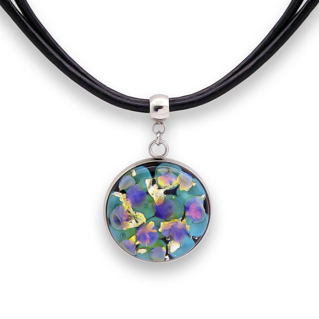 Колье изготовлено из натуральной кожи, муранского стекла и гипоаллергенной ювелирной стали, что очень важно для людей с чувствительной кожей. Металл не темнеет и не подвергается воздействиям окружающей среды, надолго обеспечивая красивый внешний вид изделия. Длина колье - 46 см + 5 см. удлиняющая цепочка. Диаметр стеклянного элемента - 2,5 см. Вес - 13 гр.­