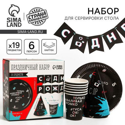• Посуда одноразовая бумажная «Туса», 6 тарелок, 6 стаканов, 6 колпаков, 1 гирлянда