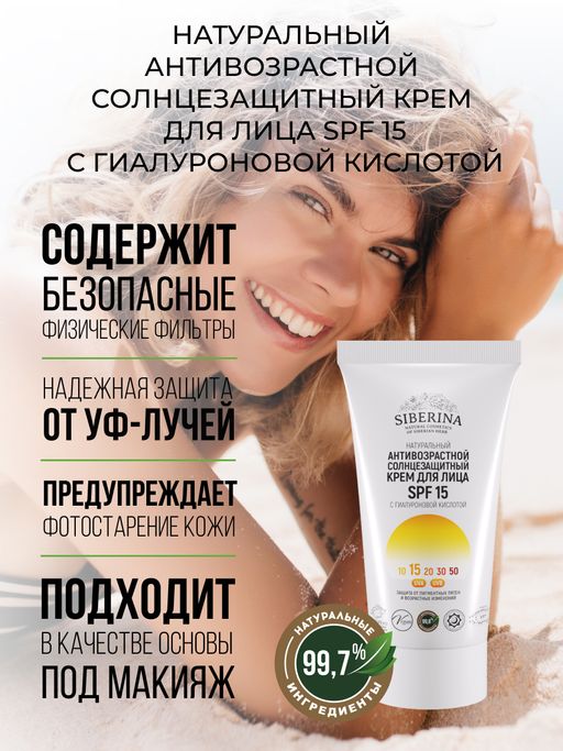 • Антивозрастной солнцезащитный крем для лица SPF 15 с гиалуроновой кислотой SIBERINA