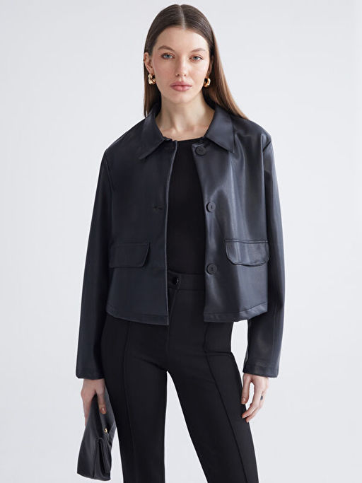 G?mlek Yaka Kad?n Deri G?r?n?ml? Ceket