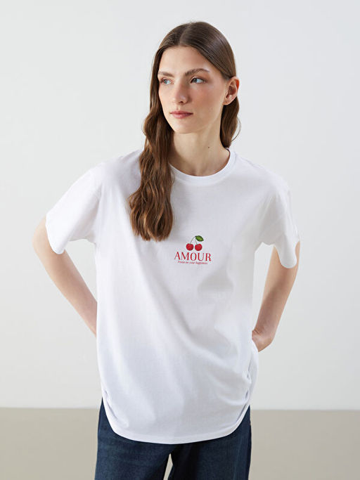 Bisiklet Yaka Kiraz Bask?l? Kad?n Ti??rt