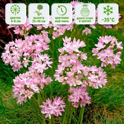 Время цветения декоративного лука Roseum приходится на май-июнь, образуя в одном соцветии 15-20 обаятельных звездчатых цветков, сиренево-розового оттенка с бордовой прожилкой, по середине каждого лепестка, с чарующими ярко-желтыми пыльниками. Листья линейные, нежно-зеленые с заостренным концом, что придает особый контраст декоративному луку Roseum, листья отмирают сразу после того как выпускает цветонос высотою 25-30 см.
