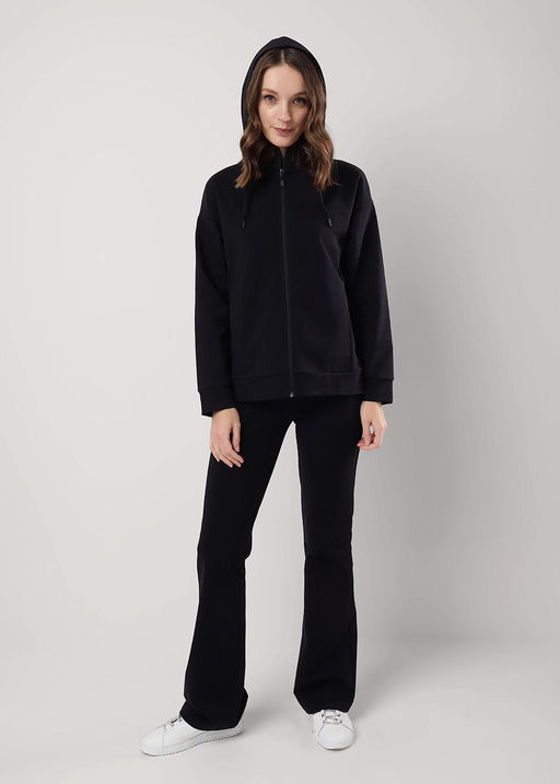 Куртка на молнии из хлопкового трикотажного полотна футер 2-х нитки. Длинный рукав со спущенной линией плеча. По горловине капюшон на подкладе со шнуром. По переду рельефы с карманами в швах. По низу изделия манжет. Состав: