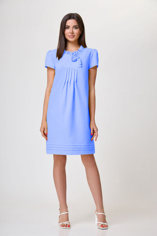 Платье женское полуприлегающего силуэта длиной выше колен. Рукав втачной короткий. По окату рукава сборка. По переду платья кокетка. Ниже линии кокетки пять защипов. Вырез горловины назапах до уровня кокетки. Низ переда декорирован тремя горизонтальными складками. Спинка со средним швом и талиевыми вытачками.