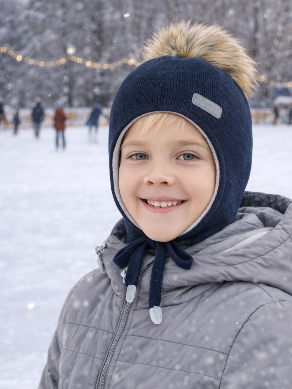 Утепленная вязаная шапка, изготовлена из мягкой, приятной и износостойкой пряжи. Для зимней погоды для этой модели была выбрана пряжа, в составе которой 30% мериноса и 70% акрила. Кроме согревающей пряжи в шапке есть утеплитель синтепон 100гр/м2 и флисовая подкладка. Удлиненные уши с завязками помогают лучше сохранять тепло. ДЛЯ того чтобы шапочка хорошо сидела на ребенке нужно правильно определить размер. Для этого воспользуйтесь таблицей. Шапочка однотонная, с большим помпоном из искусственного меха на макушке. Для лучшей видимости ребенка в темное время суток спереди небольшая светоотражающая нашивка.