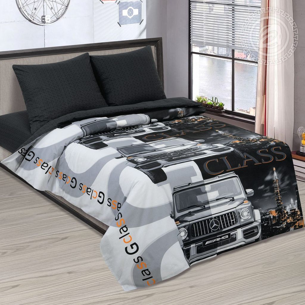 На комплекте из поплина Статус один из самых элитных и стильных автомобилей, который точно понравится мальчишкам. Постельное белье для подростков выполнено в лаконичной цветовой гамме и украшено видами ночного города. Кажется, будто внедорожник мчится по дороге мимо светящихся огней, неоновых вывесок и небоскребов.