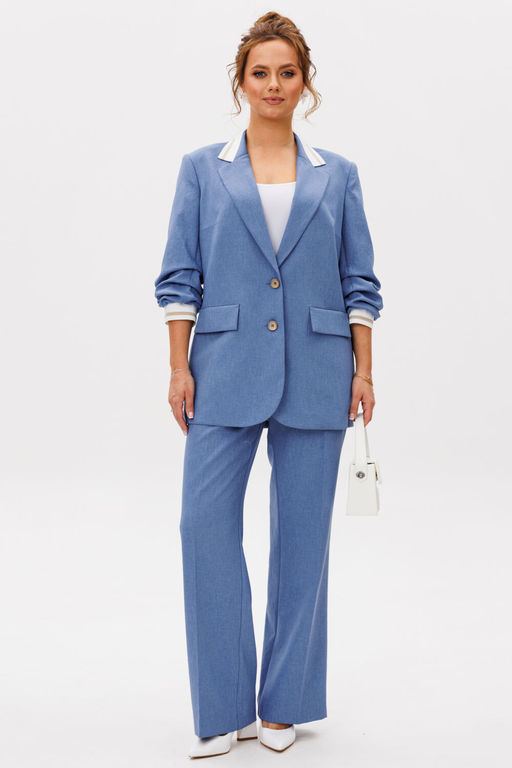 Жакет полуприлегающего силуэта, выполнен из костюмной ткани (не тянется) с отделкой из довяза на подкладке. Перед с нагрудными вытачками и настрочными клапанами. Застежка центральная на петли-пуговицы. Горловина оформлена воротником пиджачного типа с лацканом. Спинка со средним швом. Рукава втачные, двухшовные с мягкими складками и манжетой из довяза.