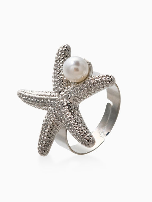 • Кольцо "Морская звезда" с бусиной, безразмерное, цвет белый в серебре