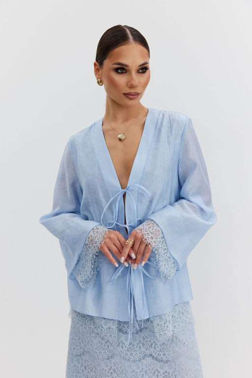 Блузка женская свободного силуэта, из полупрозрачной вуали. Спинка и перед на кружевной подкладке. Застежка на планку с тремя завязками. Рукав втачной длинный расширенный книзу, по низу рукава кружевная широкая манжета, имитирующая многослойность.