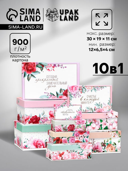 Подарочные коробки - идеальное решение для упаковки вашего подарка на 8 марта, 23 февраля, 14 февраля, Новый год, Рождество, день рождения и другие праздники. Во-первых, подарочная упаковка смотрится стильно благодаря красивому дизайну. Во-вторых, очень практично и можно поместить сразу несколько презентов. В-третьих, создаёт интригу для человека, которому приготовили подарок. Так же коробки можно использовать для хранения аксессуаров дома.Все размеры коробок:— 29,5 х 18,5 х 11 см;— 28,5 х 18,5 х 12 см;— 26 х 17,5 х 11 см;— 23,5 х 15,5 х 10 см;— 21 х 14 х 9 см;— 19 х 13 х 8 см;— 17,5 х 11 х 7 см;— 15 х 9,5 х 6 см;— 13,5 х 8 х 5 см;— 12 х 6,5 х 4 см. Набор: Да. Форма: Прямоугольная. Плотность, г/м²: 900. Длина, см: 30. Ширина, см: 19. Высота, см: 11. Количество вложений в наборе: 10 в 1. Высота большей коробки, см: 11. Ширина большей коробки, см: 18.5. Длина большей коробки, см: 29.5. Тематика: Цветочно-растительная. Символ года: Нет. Тематика праздника: 8 Марта. Тематика праздника: Универсальная тематика. Вид: Жёсткие (крышка+дно). Вид: Наборы коробок. Вид: Прямоугольные. Размер: Большой (25-45 см). Форма: Прямоугольная. Ручки: Да. Бесплатная доставка: Да. Наша разработка: Да.