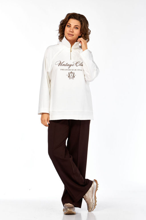 Комплект брючный двухпредметный, состоит из джемпера и брюк. Джемпер свободного силуэта изготовлен из хлопкового полотна, с воротником стойка на молнии. Перед и спинка в области бедер с декоративным подрезом. Рукава реглан. Низ изделия,низ рукавов и швы втачивания  рукавов выполнены необработанным срезом. Джемпер дополнен дизайнерской печатью. Брюки прямого силуэта с притачным поясом на эластичной тесьме. В передних деталях брюк обработаны боковые карманы  и застрочены канты.